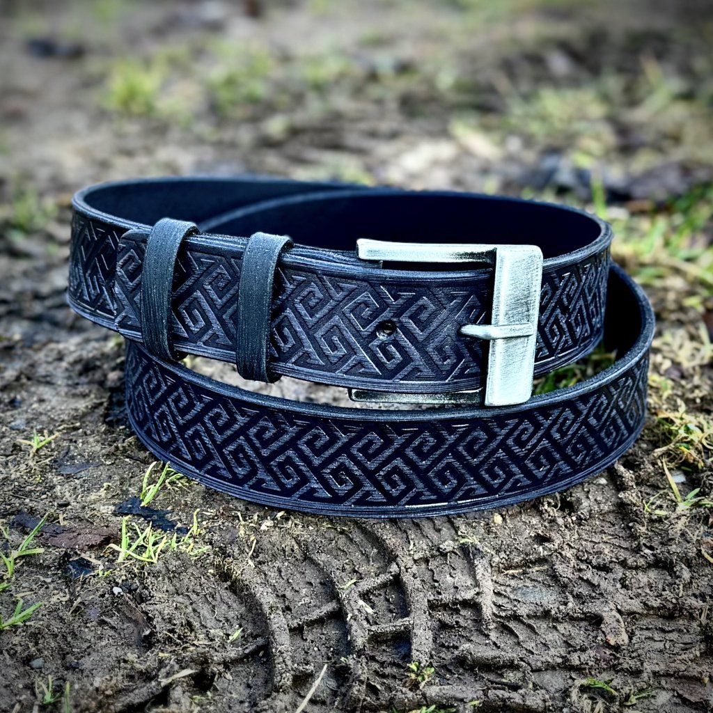 Černý kožený pásek zdobený keltským vzorem s originální povrchovou úpravou.