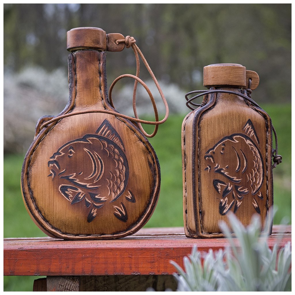 Poctivý kožený obal chrání vnitřní skleněnou nádobu před nárazy a navíc vám ani v zimě nebude placatka v ruce klouzat!.