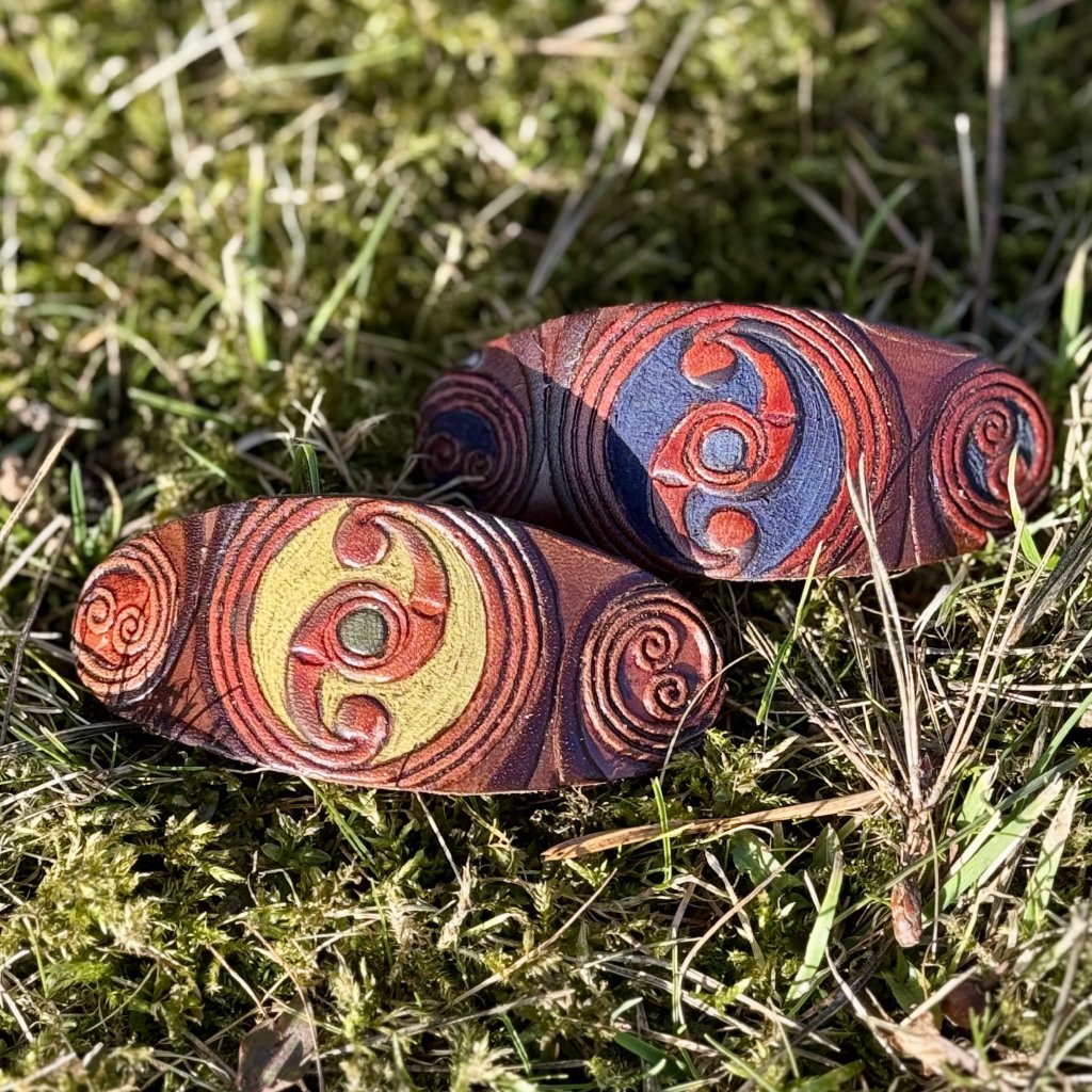 Kožené spony tvoříme buď s nerezovou sponou francouzského typu o délce 8 cm, nebo s dřevěnou jehlicí. O zdobení se stará Míša a většina spon se ručně vyřezává, případně jsou na sponu vyraženy motivy a následně se vylaďují detaily. Jak zdobení vypadá se můžete podívat v přiloženém videu níže.