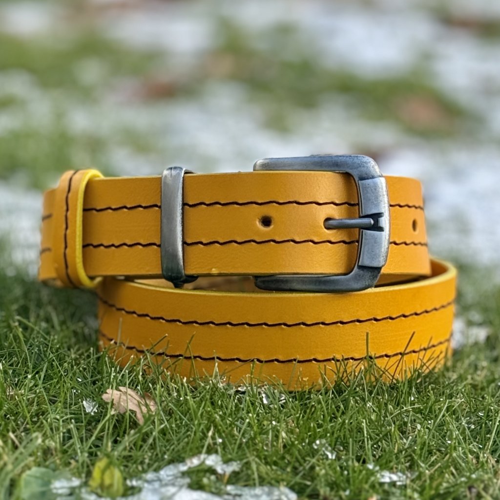 Žlutý kožený pásek pro rozveselení vašeho šatníku.je prošívaný černou nití.